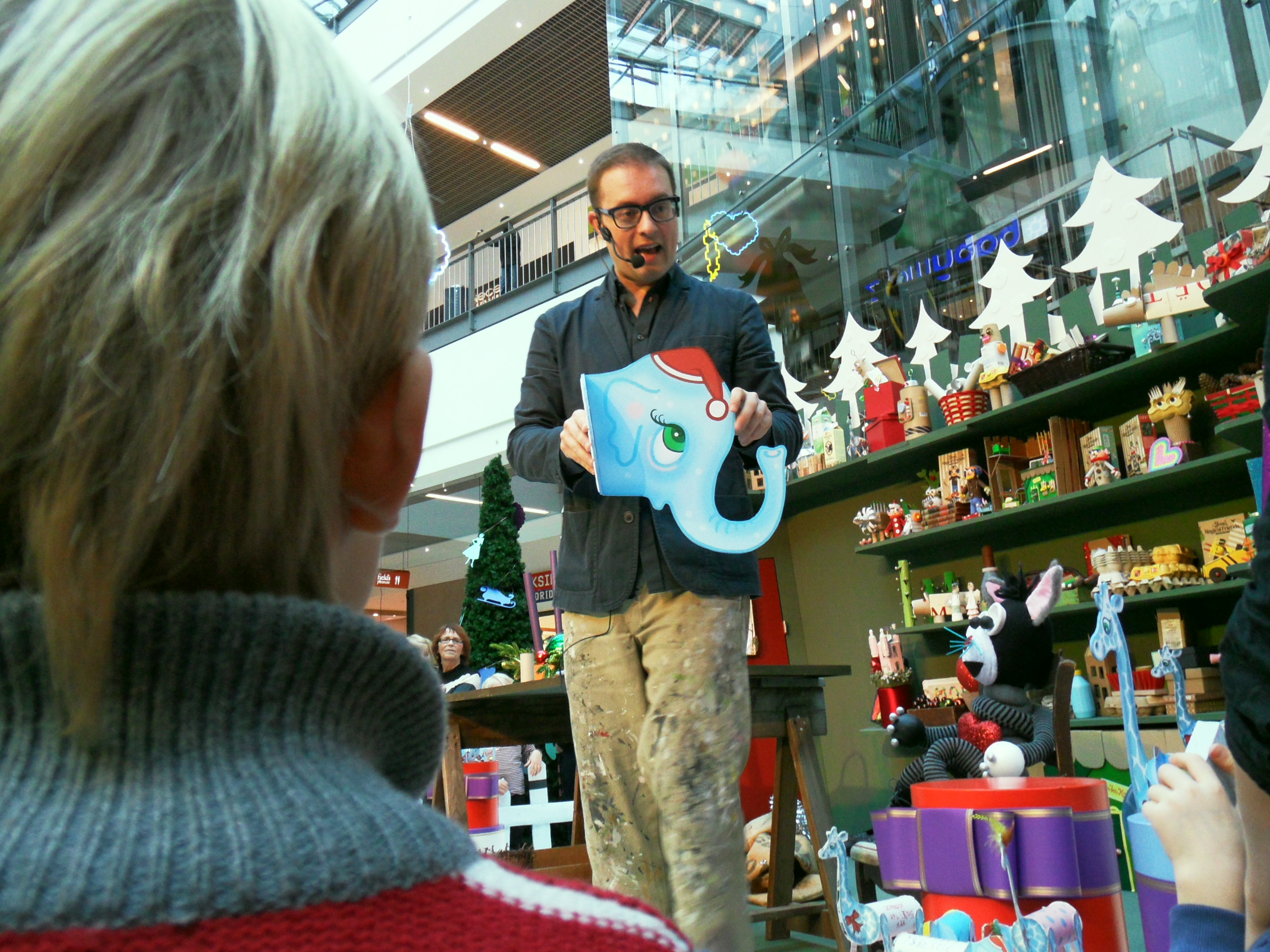 Så når nu man bor i København og Shane har juleværksted med show i Fields hver weekend i julemåneden, kan man som mor vel ikke være andet bekendt end at tage derhen, vel? Og selvom jeg hader indkøbscentre i weekenden og endnu mere i weekender op til jul, pakkede vi lillesøster i klapvognen og drog med metroen til Ørestaden. Og det var det hele værd. Shane lavede et fint lille show og havde bagefter stort overskud og god tid til at møde ALLE sine små fans. Min søns glæde og stolthed over at møde sit idol var helt sikkert også værd at stå en halv time i kø efter. Altså køen for at møde Shane personligt. Se bare: