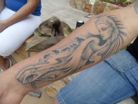 Rolf og jeg stod og ventede på bussen ved Flintholm station i København, da jeg fik øje på én af hans mange flotte tatoveringer, en blomst med navnet Isabella skrevet i bladene. Den er lavet af Victor Chili og jeg fik lov til at tage et billede og et smil med på vejen. Jeg glemte bare at spørge om, hvem Isabella er….