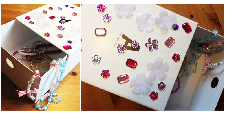 En ANGULUS-begyndersko-skoæske (langt ord, men mest rammende om de fine skuffe-skoæsker der følger med de mindste størrelser fra ANGULUS) + perler, glitter og diamanter + en klat lim eller 30 = DIY-prinsesse-smykkeskrin! Okay, ikke flere bindestregsord, bare en hyggelig idé til lidt kreativitet i det lille hjem. Passer især godt til plastikperler og H&M´s uendelige samling af Hello Kitty/My Little Pony/Disney Prinsesse-smykker. Og de forgyldte armbånd man kan snuppe fra sin mor´s smykkeskrin, når hun ikke ser det….