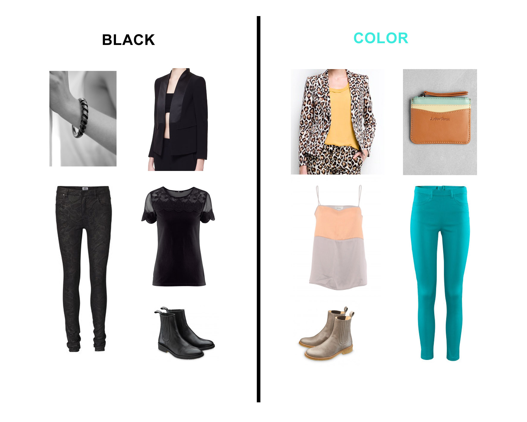 Black: Armbånd & Other Stories 150,- ; Blazer ZARA 899,- ; Buks Vero Moda 299,95 ; Top H&M 79,95 ; Støvler ANGULUS 1.199,- Color: Blazer Mango 599,- ; Wallet & Other Stories 195,- ; Top PrimIam 349,- ; Buks H&M 99,- ; Støvler ANGULUS 1.199,-