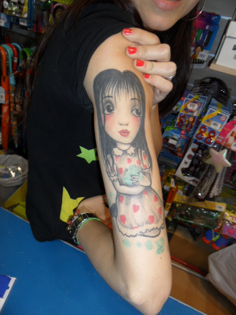 Jeg gik egentligt ind i legetøjsbutikken for at finde en fastelavnsdragt til min søn, men jeg endte med at komme ud med fotos af Gisela´s super flotte tatovering. Hun stod og ekspederede og ville med glæde lade mig forevige hendes tattoo. Fastelavnsdragten havde de ikke, men her er billederne:
