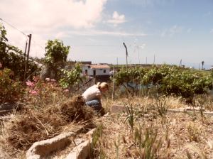 Blommetræet blomstrerHønsene søger skyggeCitronerne er snart modne - og der er flere på vejHvidløgene er klar til at blive høstetUngerne hygger sig i solenDe første blommer er på vejAlting vokser vildt og hurtig - den kinesiske bonde er næsten blevet væk i "junglen"Margueritterne har indtaget blomsterbedetDet ser ud til der også kommer vindruer i årFerskentræet viser sine første pink knopper Solnedgang over nabo-øen La Gomera set fra haven